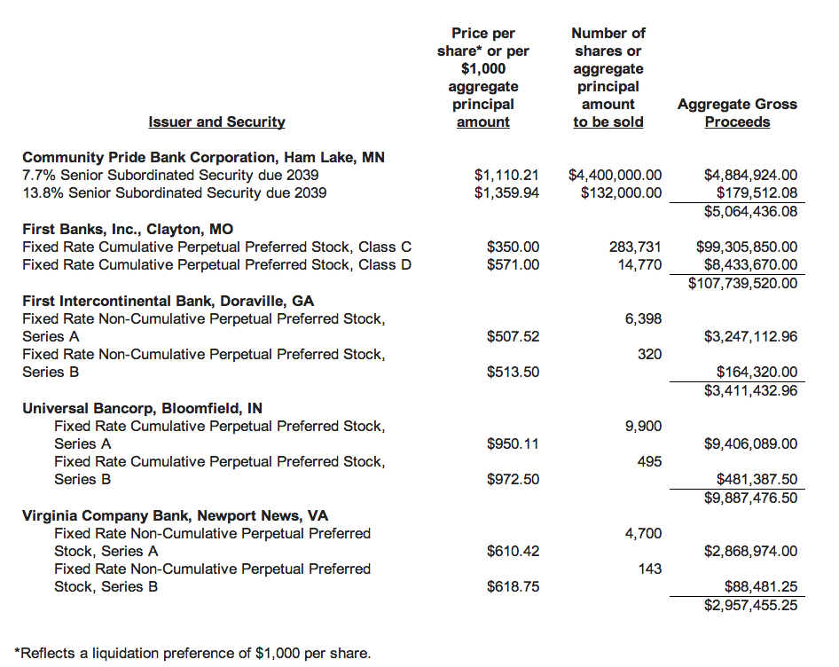 In an effort to wind down the remaining Troubled Asset Relief Program, the Treasury priced auctions of preferred stock and subordinated debt in the following five institutions: Community Pride Bank Corporation; First Banks, Inc.; First Intercontinental Bank; Universal Bancorp; and Virginia Company Bank.