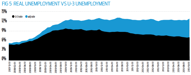 Figure 3 shows how the U-3, U-5 and U-6 rates compare over time: not surprisingly, the U-6 represents the highest rate, most recently standing at 12.7% of the U.S. work force counting as unemployed by that measure in November 2013.