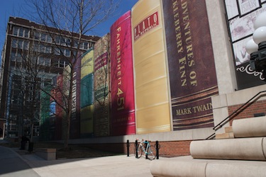 The library is designed like a shelf of books, complete with 22 titles reflecting a wide variety of reading interests as suggested by Kansas City readers and then selected by The Kansas City Public Library Board of Trustees.