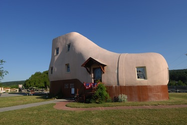 Built in 1948, the building is a wood frame structure covered with wire lath and coated with cement stucco. The giant shoe was created as a giant advertisement originally used as a guesthouse, complete with five different levels and three bedrooms.
