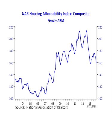As a whole, affordability is nationally down from 179.3 in May 2013 to 159.3 in May 2014, the National Association of Realtors said.
