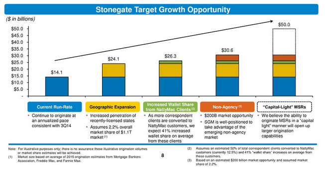 “Geographic expansion, increased wallet share and the emerging non-agency market will drive origination, financing and servicing growth,” the presentation slides said.