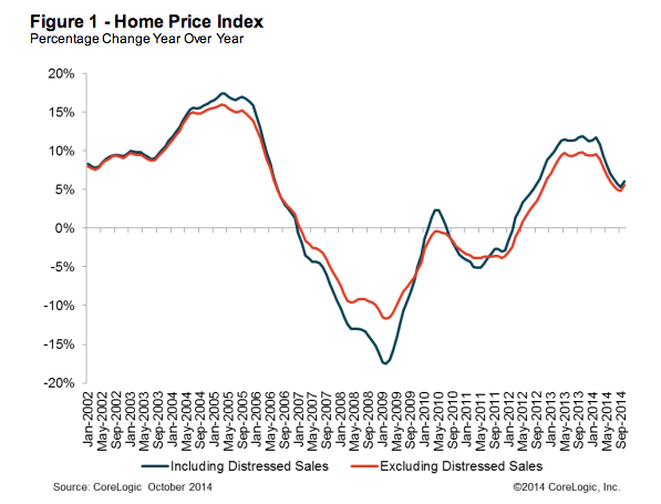 Month-over-month, home prices nationwide, including distressed sales, grew by 0.5% in October 2014 compared to September 2014.