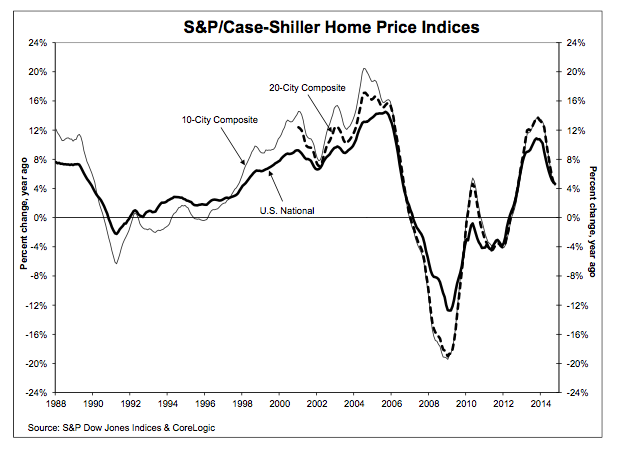 The S&P/Case-Shiller U.S. National Home Price Index, which covers all nine U.S. census divisions, posted a slight decline, with a 4.6% annual gain in October 2014 versus 4.8% in September.