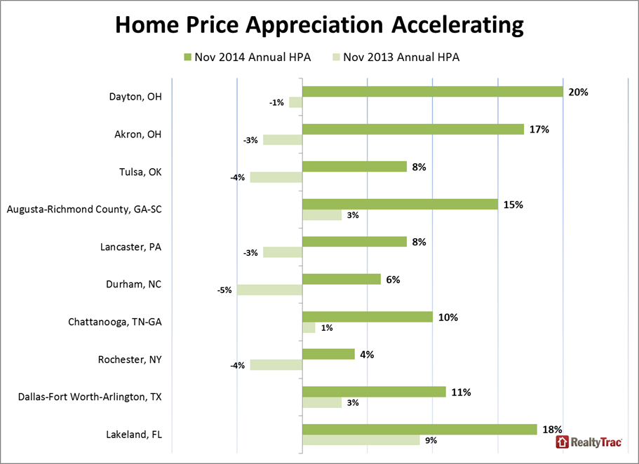 Dayton, Ohio, came in at the top of the list, moving from just -1% annual home price appreciation in November 2013, to 20% annual HPA in November 2014.