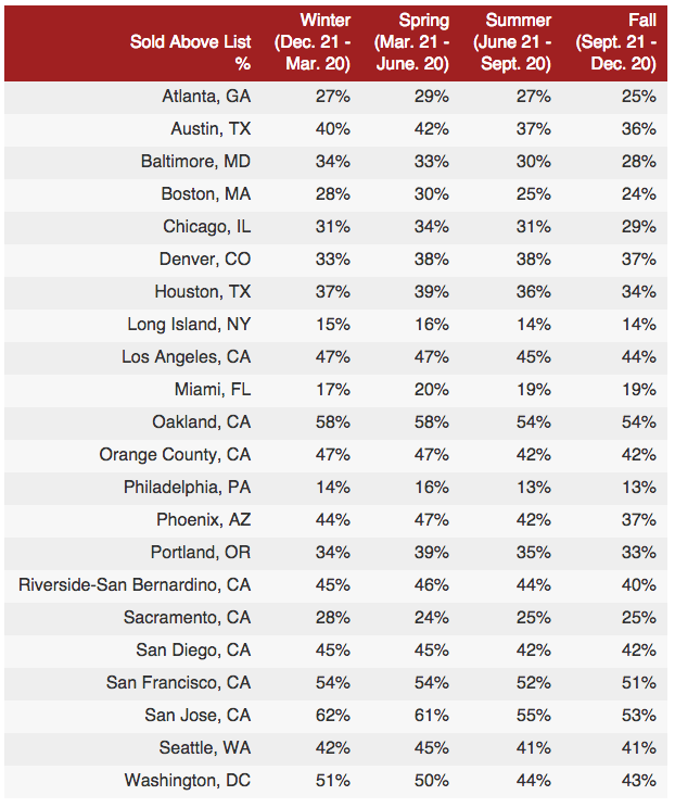 As for winter, 38%, just one percentage point less than spring, sold within 30 days, and 14% sold for more than list price.