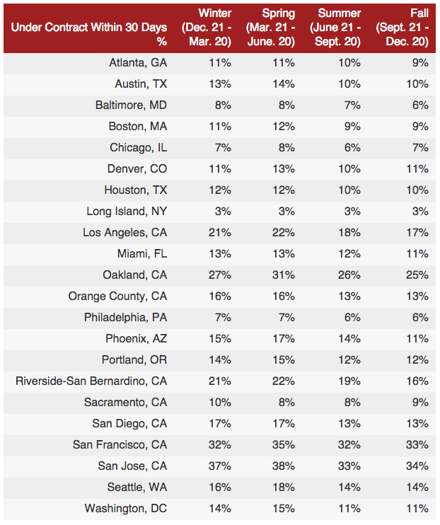 Summer was next, with 36% of listings under contract within 30 days and 12% selling at a premium, leaving fall as the worst season to sell.