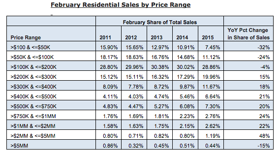 “Inventory of distressed properties is drying up in many markets even while demand for those properties — which typically fall into the target market for both investors and first-time homebuyers — is ramping up. That is in turn resulting in nationwide home prices skewing higher as a smaller share of homes sell at the lower end of the market.”