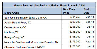 Meanwhile, 17 metro areas reached new peaks in median home prices in 2014.