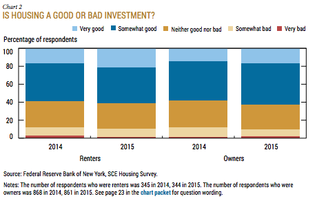 The survey found that more than 60% of both renters and owners think that buying property in their zip code is a (very or somewhat) good investment, while only about 10% think it is a bad investment.