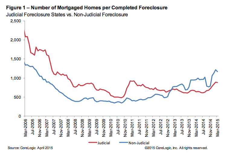 There were 40,000 completed foreclosures nationwide in April 2015, down from 50,000 in April 2014, marking a decrease of 65.8% from the peak of completed foreclosures in September 2010.