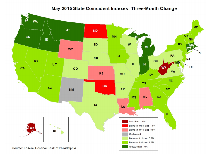 The job situation improved in almost every state over the last three months, according to the latest state coincident indexes report from the Federal Reserve Bank of Philadelphia.