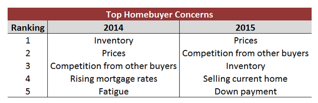 Once again, home prices, competition from other borrowers and housing inventory made the list of top homebuyers concerns in 2015, according to the latest Redfin report.