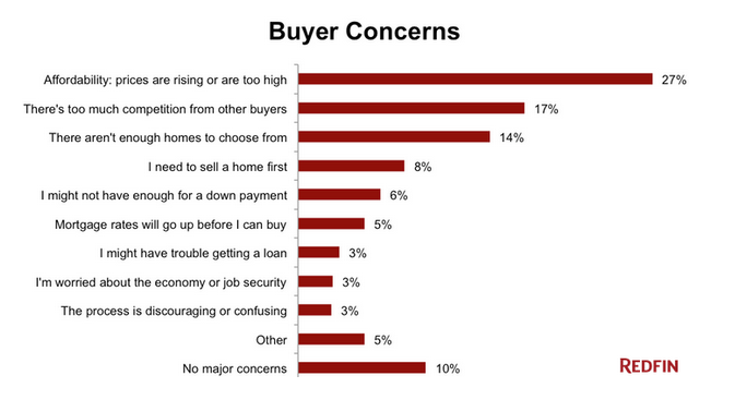 Redfin explained that this did not come as a giant surprise given that nearly 27% of the more than 3,500 buyers it heard from last month listed high or rising prices as their top concern.