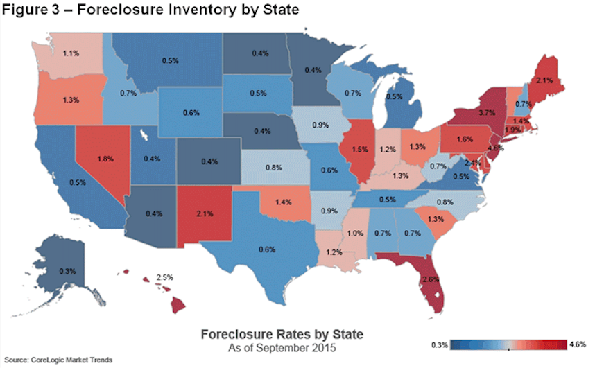 "The largest improvements in the foreclosure inventory continue to be in judicial states on the East Coast such as Florida and New Jersey," said Sam Khater, deputy chief economist for CoreLogic. "While the overwhelming majority of states are experiencing declines in their foreclosure rates, four states experienced small increases compared with a year ago."