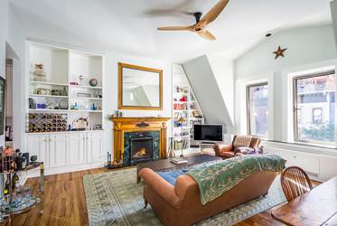 In the master bedroom suite, a seating area offers a spot to relax, while a large picture window and a second wood-burning fireplace cozy up the space. In the master bath, a claw-foot bathtub is the perfect spot to lounge after a day at work — or a night of stand-up. A skylit kitchen features top-of-the-line appliances, including a Wolf range and oven, Sub-Zero fridge, and Miele dishwasher.