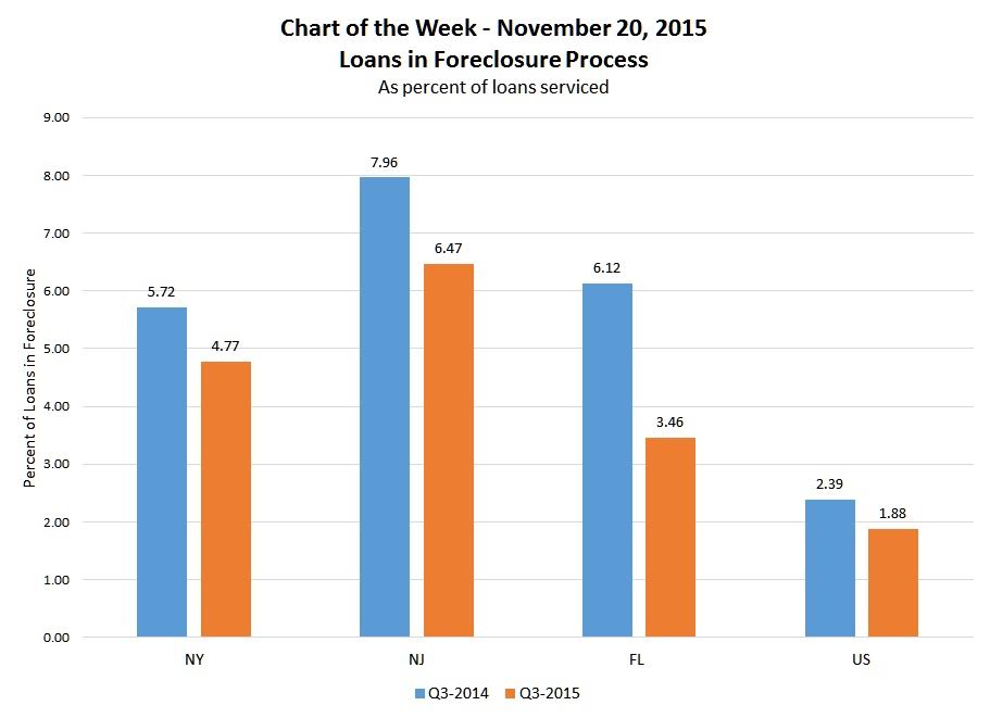 The most recent Mortgage Bankers Association’s chart of the week shows that since the fourth quarter of 2012, New Jersey, New York, and Florida have had the highest percentage of loans in foreclosure in the nation.