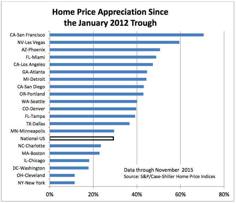 Fourteen cities reported greater price increases in the year ending November 2015 versus the year ending October 2015, with Phoenix holding the longest streak of year-over-year increases, reporting a gain of 5.9% in November 2015.