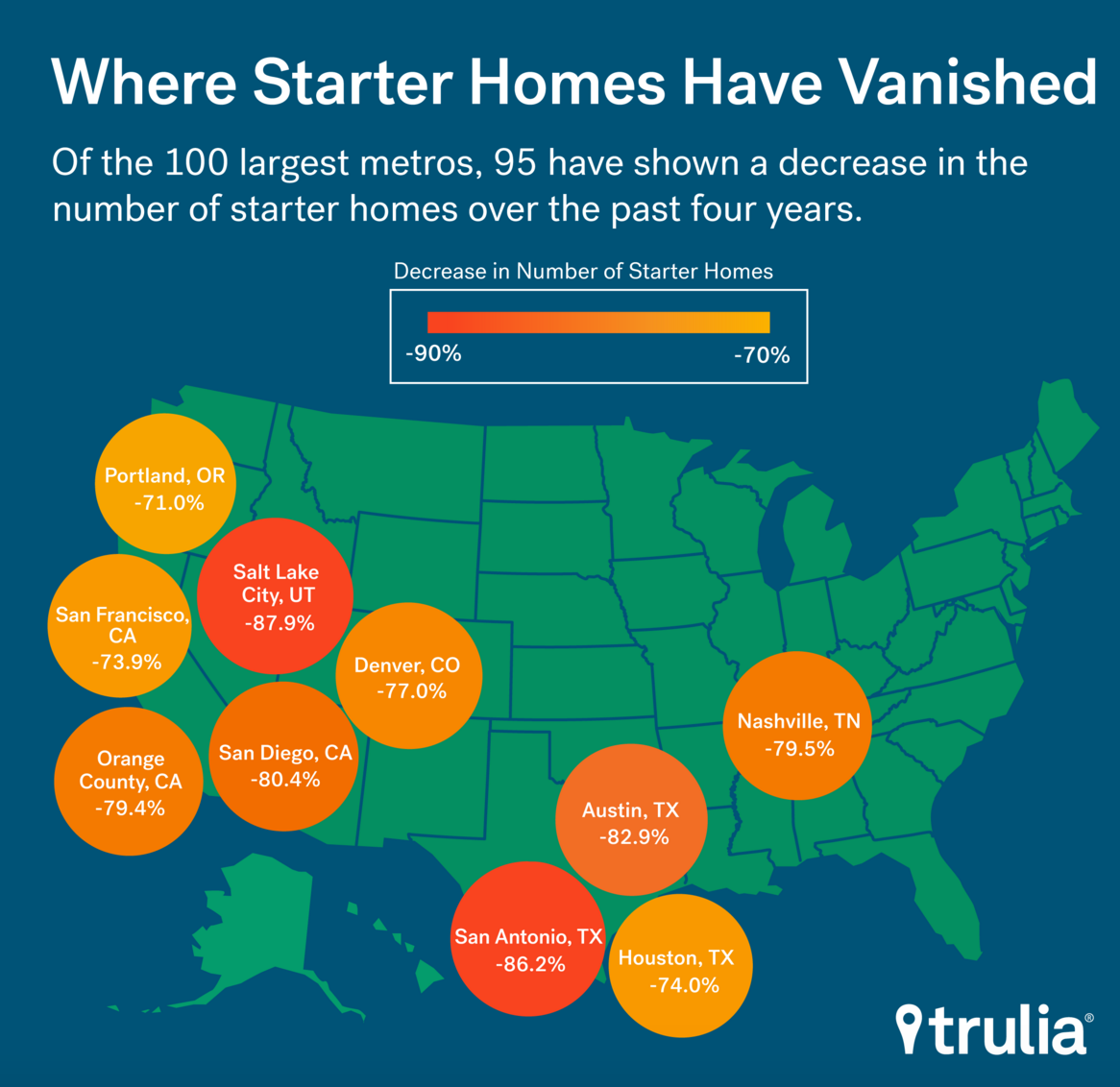 The report states that across the 100 largest metros, 95 have shown a decrease in the number of starter homes over the past four years. Of the 10 metros that have seen the largest drop, all are in the West and South. The number of starter homes in Salt Lake City has dropped the most, from 1,243 to just 151 – an 88% drop in four years.