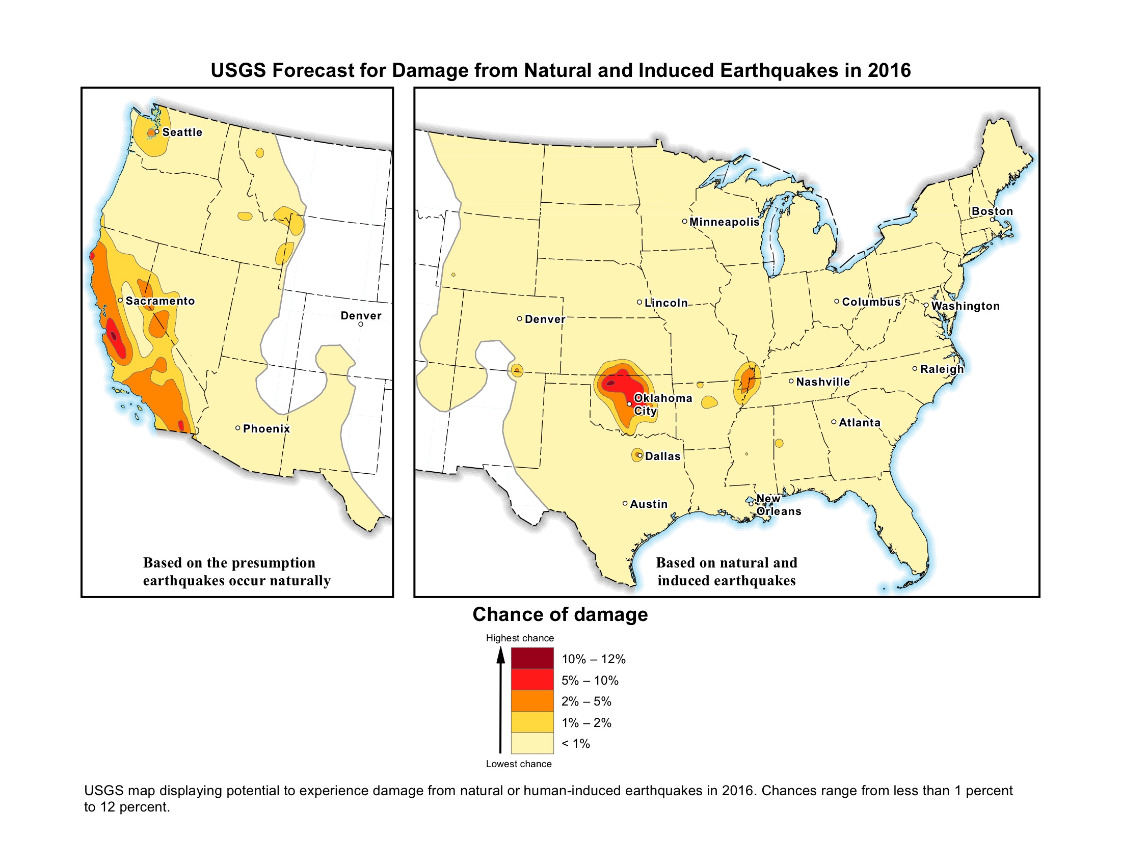 In fact, the USGS data shows that in some of those areas, the chance of damage from all types of earthquakes is similar to that of natural earthquakes in high-hazard areas of California.