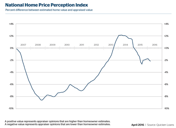 According to the recent Home Price Perception Index released by Quicken Loans, the average appraised values in March were 2.17% lower than what homeowners think their homes are valued.