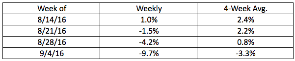 “With the holiday, the 4-week average dropped to -3.3% from a flat 0.8%. While this makes it down three weeks in a row, the less than average drop is encouraging,” explained Kevin Golden, director of analytics with a la mode.