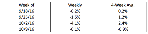 As a result of this week’s decline, the four-week moving average fell into negative territory, falling to -0.9%.