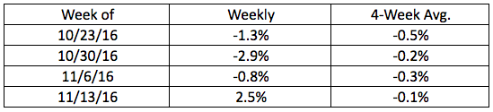 The uptick in volume help boost the four-week average, but it is still negative at -0.1%.