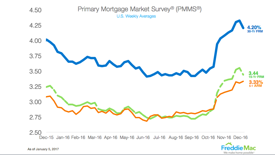 Now, looking at the latest Freddie Mac report, the 30-year fixed-rate mortgage sits at 4.20% for the week ending Jan. 5, 2017, down from last week when it averaged 4.32%. However, this is still significantly higher than a year ago at this time when the 30-year FRM averaged 3.97%.