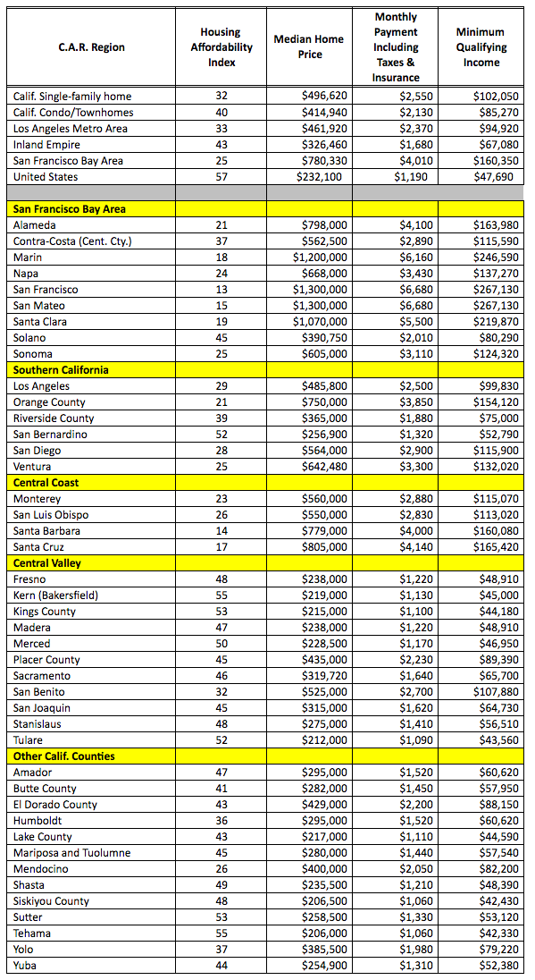 For the whole state, homebuyers needed to earn a minimum annual income of $102,050 to responsibly qualify for the purchase of a $496,620 statewide median-priced, existing single-family home in the first quarter of 2017. The monthly payment, including taxes and insurance on a 30-year, fixed-rate loan, would be $2,550, assuming a 20% down payment and an effective composite interest rate of 4.36%.