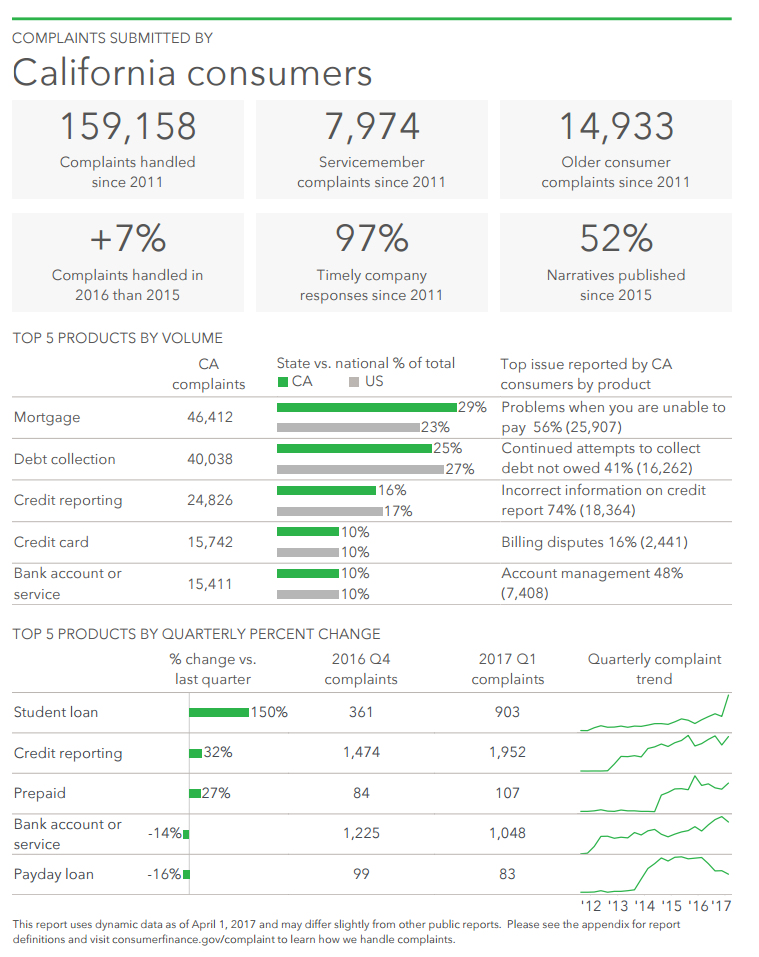 In total, California received 159,158 complaints, with mortgage complaints coming in as the No. 1 most complained about category.
