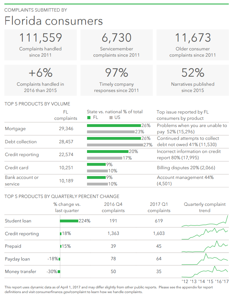 In total, Florida received 111,559 complaints, with mortgage and debt collections complaints coming in as the top complained about categories.