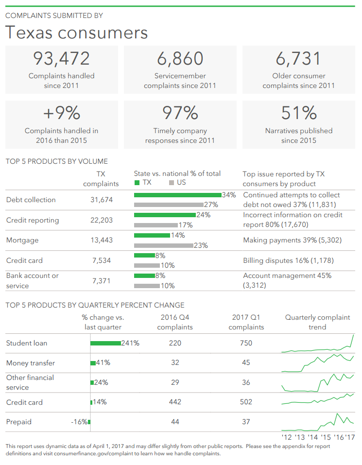In total, Texas received 93,472 complaints, with debt collection complaints coming in as the No. 1 most complained about category.