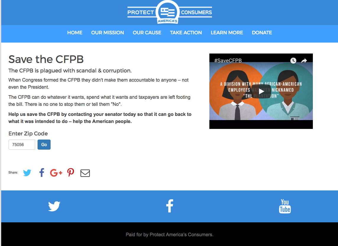 By clicking the “STOP CORDRAY” button on the page, it directs users to a page, as seen below, where they can write a letter to their senator. Protect America's Consumers will even deliver the letter.