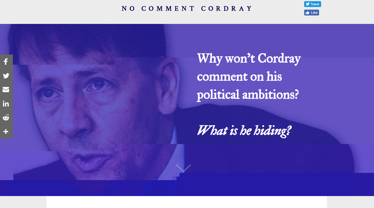 Below is a screenshot from the homepage of the website, which questions why Cordray won’t comment on his political ambitions.