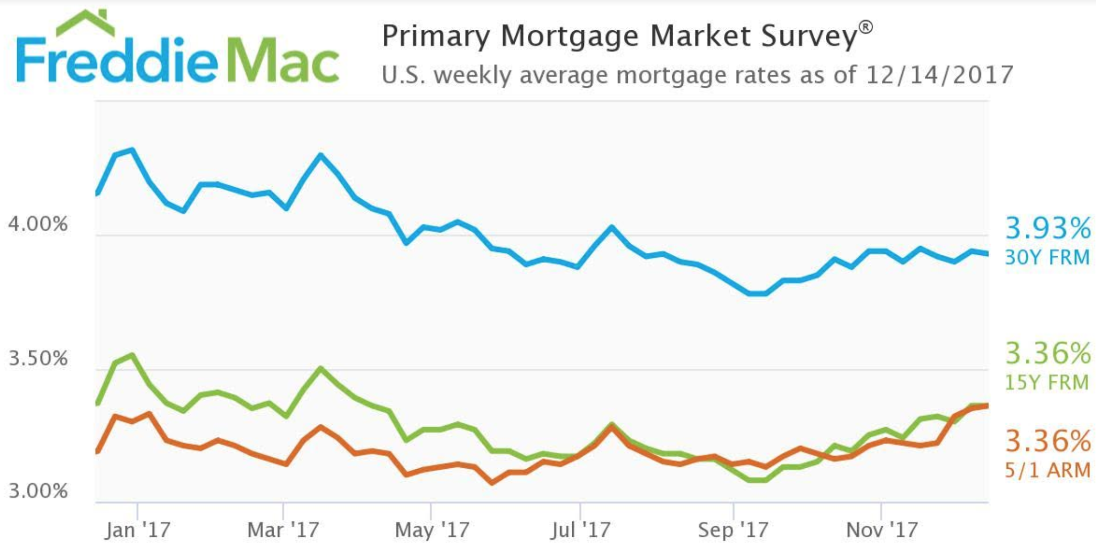 The 30-year fixed-rate mortgage decreased slightly to 3.93% for the week ending December 14, 2017. This is down from last week’s 3.94% and from 4.16% last year.