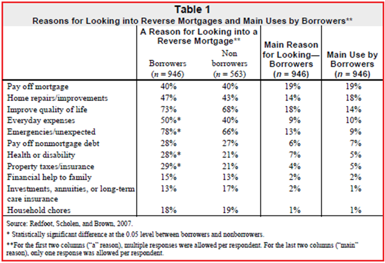 When allowed multiple responses, the largest percentage of borrowers cited, "Improve quality of life" (73%) and "Emergencies/unexpected" (78%). However, when it came to the actual use of a reverse mortgage, "Paying off mortgage" (19%) and "Home repairs/improvements" (18%) were the most common responses.