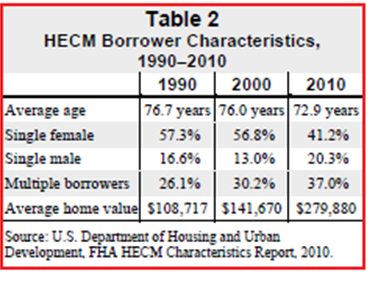 Looking at borrower characteristics, the report points to a trend of the average age of HECM borrowers as cause for concern about the long-term impact of reverse mortgages on financial security. It suggests that this creates problems since the average duration of these loans in six to seven years, but the report does not expound on the issues that are created. Since 1990, the average age of borrowers has fallen from 76.7 years old to 72.9 years old. Couples have also increased significantly from 26.1 percent of borrowers to 37.0 percent in 2010.