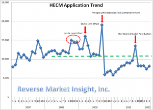 After what appears to be a weather induced decline in application volume in January, the February total increased 10.2% to 8,149 applications. According to Reverse Market Insight's (RMI's) Industry Trends Report January 2011, application volume has been hovering around 8,000 units since November.