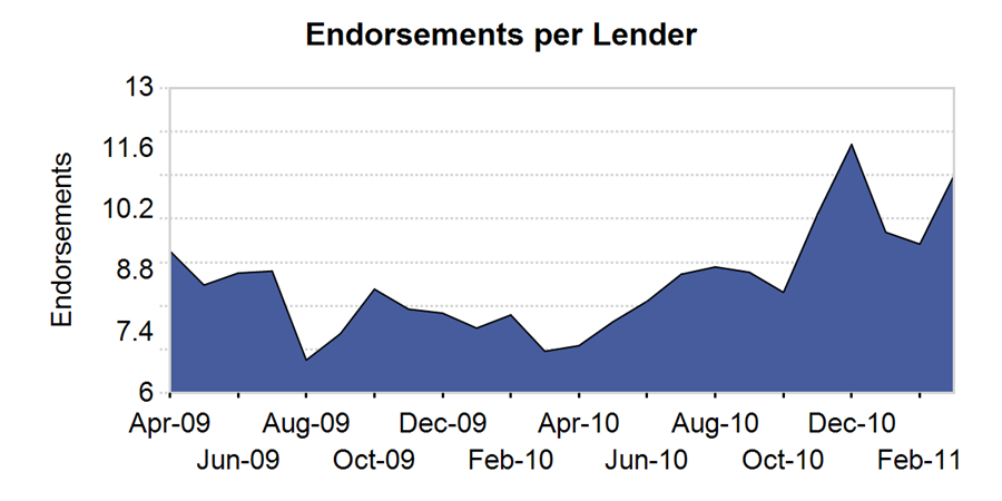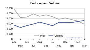 The March volume was also an increase of 5.8% over February, even while the total number of contributing lenders decreased by 9.3%. Accordingly, the average number of endorsements per lender jumped to nearly 11 units, the second highest level in the past two years.