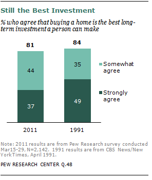 In 1991, 49 percent of adults "strongly agree" that homeownership was the best long-term investment, and 35 percent "somewhat agree", making up a total of 81 percent agreeing. In the new survey, the percentage that "strongly agree "dropped to 37 percent, with a larger percentage in the "somewhat agree" category at 44 percent.