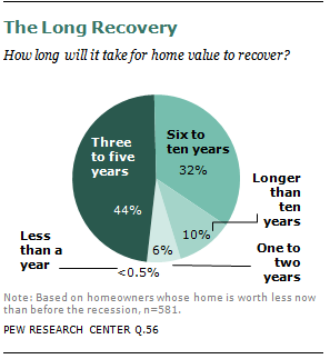 The respondents who felt their home has lost value also expressed concerns that it will take a long time for homes to recover the lost value. Only 6.5 percent think their home will recover value within two years. The largest percentage, 44 percent feel it will take 3 to 5 years, with 32 percent thinking it will be 6 to 10 years and 10 percent believing it will be longer than 10 years.