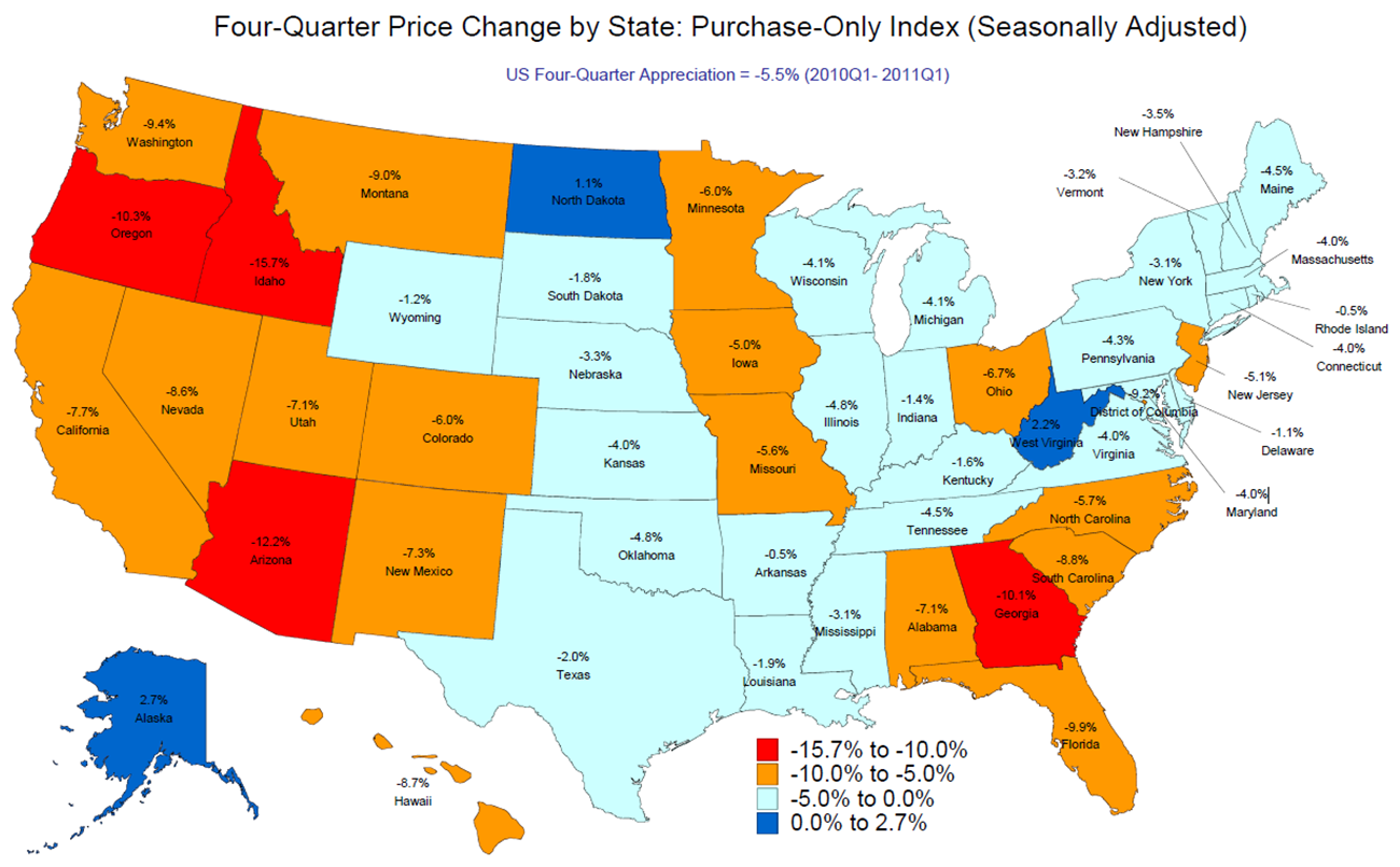 “House prices in the first quarter declined in most parts of the country,” said FHFA Acting Director Edward J. DeMarco. “In many local real estate markets, particularly those hit hard by this cycle, foreclosures and other distressed properties are still a key factor in recorded and anticipated future sales and may be delaying price stability or recovery. Fortunately, serious delinquency rates also are declining.”