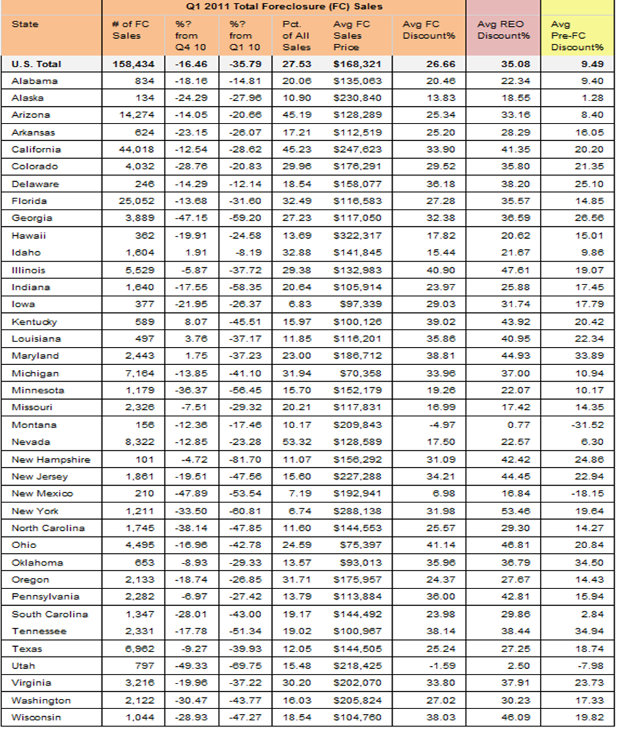 Here is an alphabetical listing of each state performed in the first quarter 2011, according to the RealtyTrac report.
