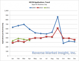 Even though there are some discouraging notes in the current HECM activity trends, they are, at least currently, ahead of pace in 2010. The industry faces on going challenges as economic factors, especially home values, continue to struggle for solid footing and sustained recovery.
