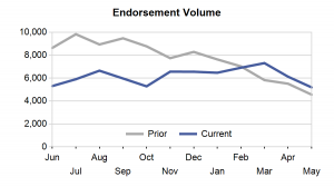 Although May production was 13.9% ahead of May 2010, the 5,188 was a 15.3% decrease from April. The endorsement volume had been steadily climbing since October 2010, reaching a 12 month peak in March, before falling in April and May.