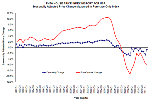 Using home sale price data from Fannie Mae and Freddie Mac, the HPI calculated a decline of 0.6% in the second quarter with an annual decline of 5.9%. Although the monthly HPI saw an increase of 0.9% in June, the level was 18.8% below the peak from April 2007. With prices of other goods rising by 4.5% in the previous year, the inflation-adjusted price of homes results in a decline in value by approximately 10%.