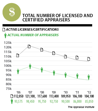 An FHA-published roster of certified appraisers lists 46,212 appraisers in the U.S. as of December 12, 2012. Compared with the 64,472 appraisers listed in September 2009, this number illustrates an alarming 28 percent decline in just three years. Also, keep in mind that just because these appraisers are listed on the roster, doesn’t mean they are necessarily active. Some could still have their licenses, but may have retired or moved on to another position in a related field.
