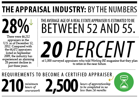 Of those who did stay, a sizable number are getting ready to retire. A recent survey by appraisal industry publication Working RE magazine revealed that 20 percent of respondents indicated plans to retire in the near future. In fact, trade associations and industry experts estimate the average age of a real estate appraiser to be between 52 and 55.