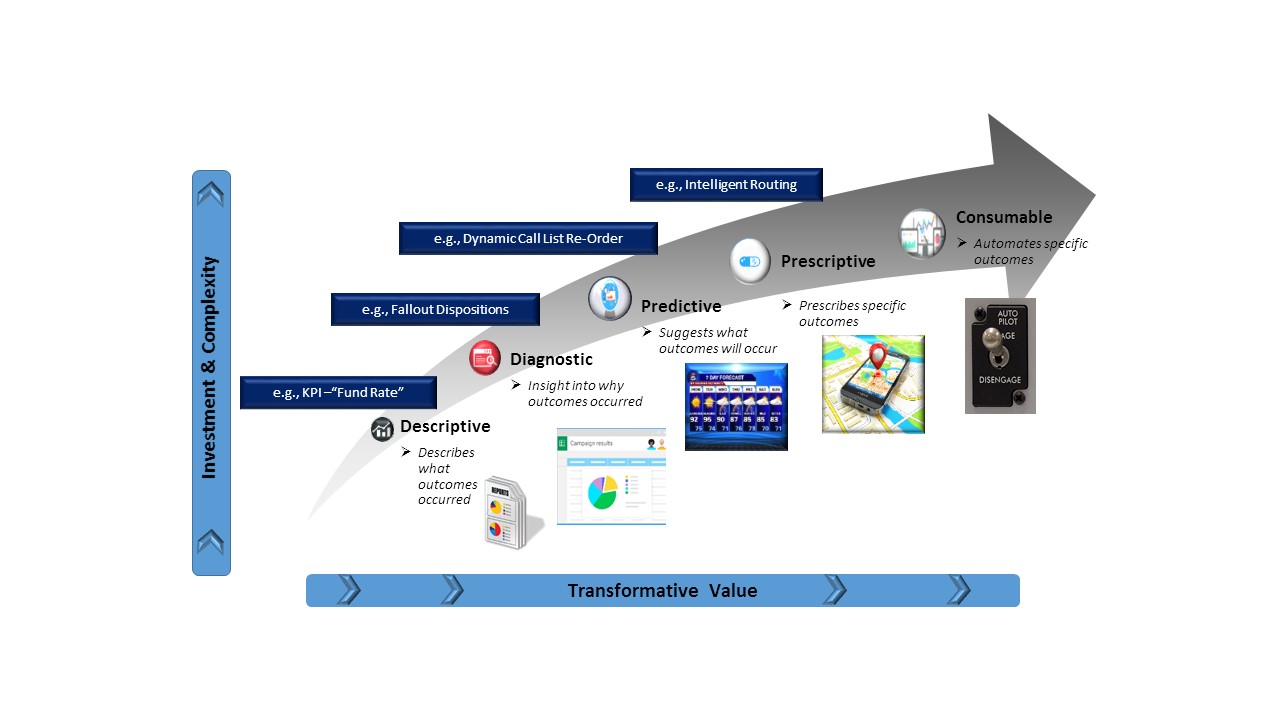 As these analytical approaches become more complex, they become more costly, either in terms of the tools or skills of the practitioners necessary to leverage them; however, each level of sophistication increases the value of the workforce leveraging their results, offering the opportunity to deliver solutions and service quicker, with a more optimal utilization of human assets.